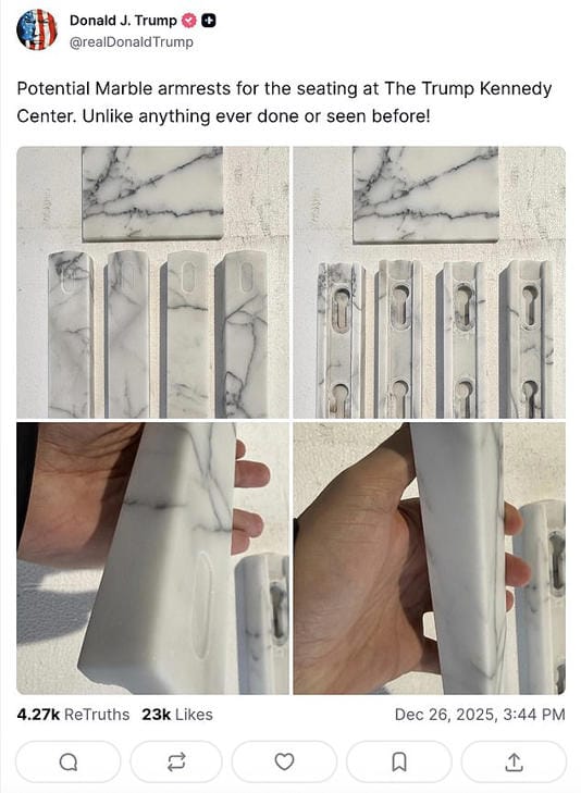 The project is currently a legal lightning rod. In October 2025, the historic East Wing was demolished to make way for the 90,000-square-foot ballroom—an addition that will be nearly twice the size of the original White House. While a federal judge has so far allowed construction to continue, citing “national security concerns” because of the presidential bunker located beneath the site, Trump is facing a barrage of lawsuits. From his plan to paint the granite Eisenhower Executive Office Building white to his proposal for marble armrests at the newly renamed “Trump-Kennedy Center,” the President is systematically attempting to replace D.C.’s “slate gray” aesthetic with the gold and marble opulence of a modern-day Versailles.