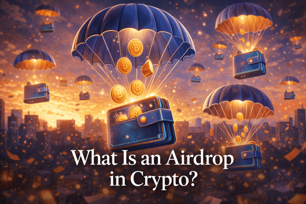 An airdrop is a method crypto projects use to distribute tokens directly into users’ wallets, usually for free, as part of a launch, promotion, or network incentive. Instead of selling tokens to investors, projects allocate a portion of their supply to users who meet specific criteria, such as holding another cryptocurrency, using a platform, or interacting with a blockchain.