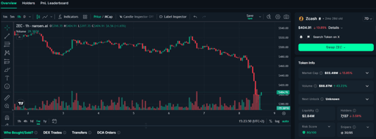 Market reaction was mixed. ZEC fell roughly 16% over the past 24 hours to trade near $406. Despite the drop, on-chain data showed large holders increasing exposure, with whales and newly created wallets accumulating millions of dollars’ worth of ZEC during the selloff.